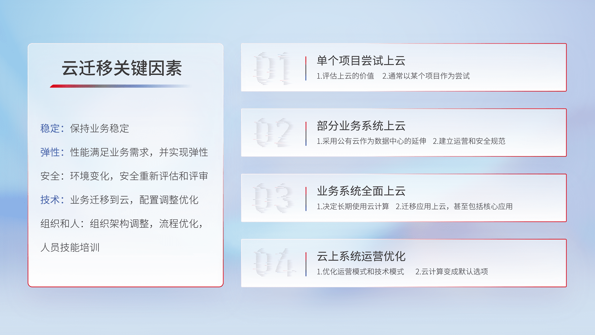 结合实际业务,,,,从规划设计、、云平台选型、、、云原生改造、、、、数据迁移、、、、集成交付,,,迁移全过程为客户识别最佳上云路径,,,做好风险识别管理,,,设计网络架构、、、身份权限、、安全审计合规、、操作审计、、、、日志审计、、、监控告警策略、、、、多站点容灾设计等,,对云上基础设施进行整体规划,,,,提升IT治理水平,,以满足弹性、、、高可用、、高性能的需求。。。