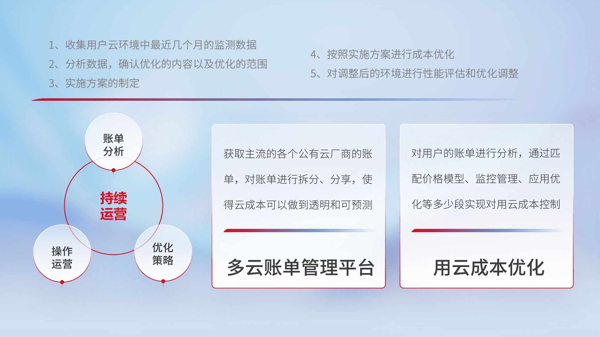 通过多云纳管,,,以统一的资源数据模型把客户的云资源进行抽象和封装,,,进而实现对多云资源的统一操作,,保障云资源管理的可靠性、、稳定性与可用性。。量身定制化运维内容,,,配置、、、、开发运维、、、补丁管理、、、备份、、监控、、、、认证和访问管理、、审计和日常巡检等,,,保障在用云过程中的可靠度,,,,稳定度以及高可用率。。